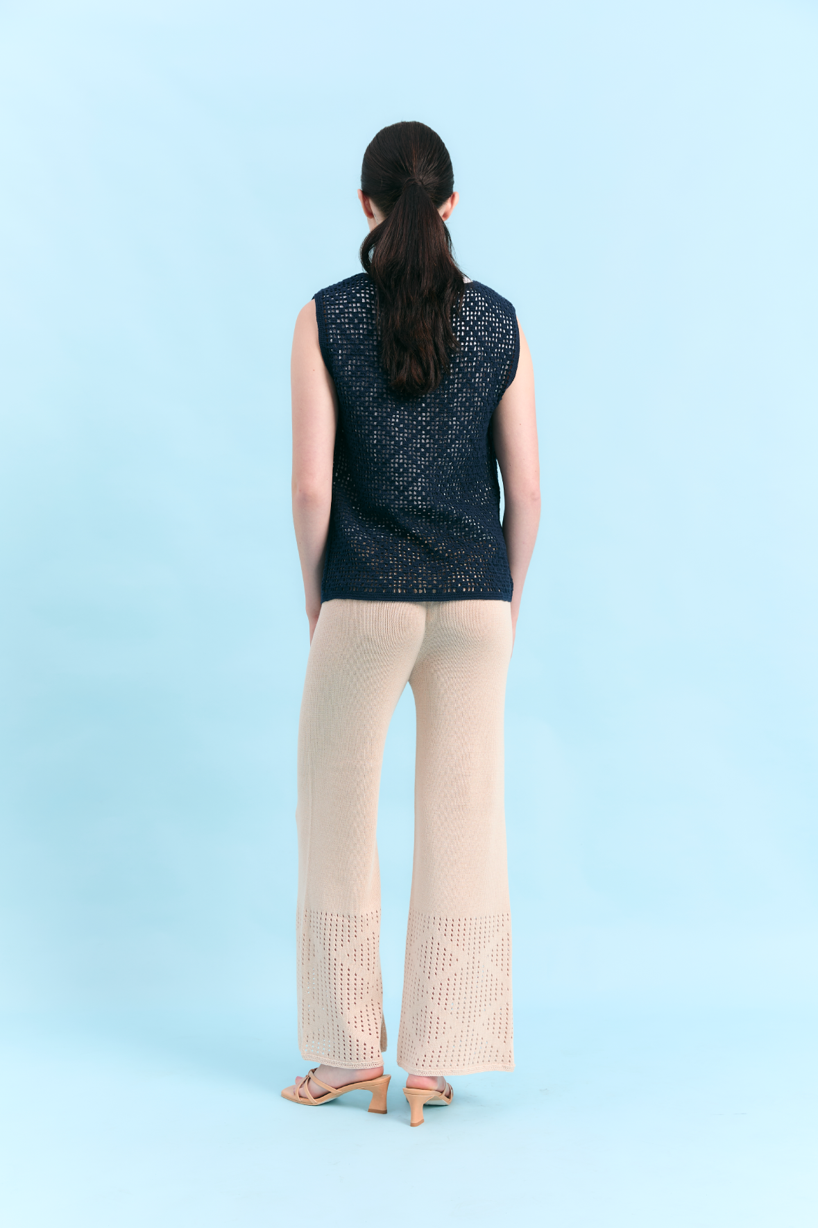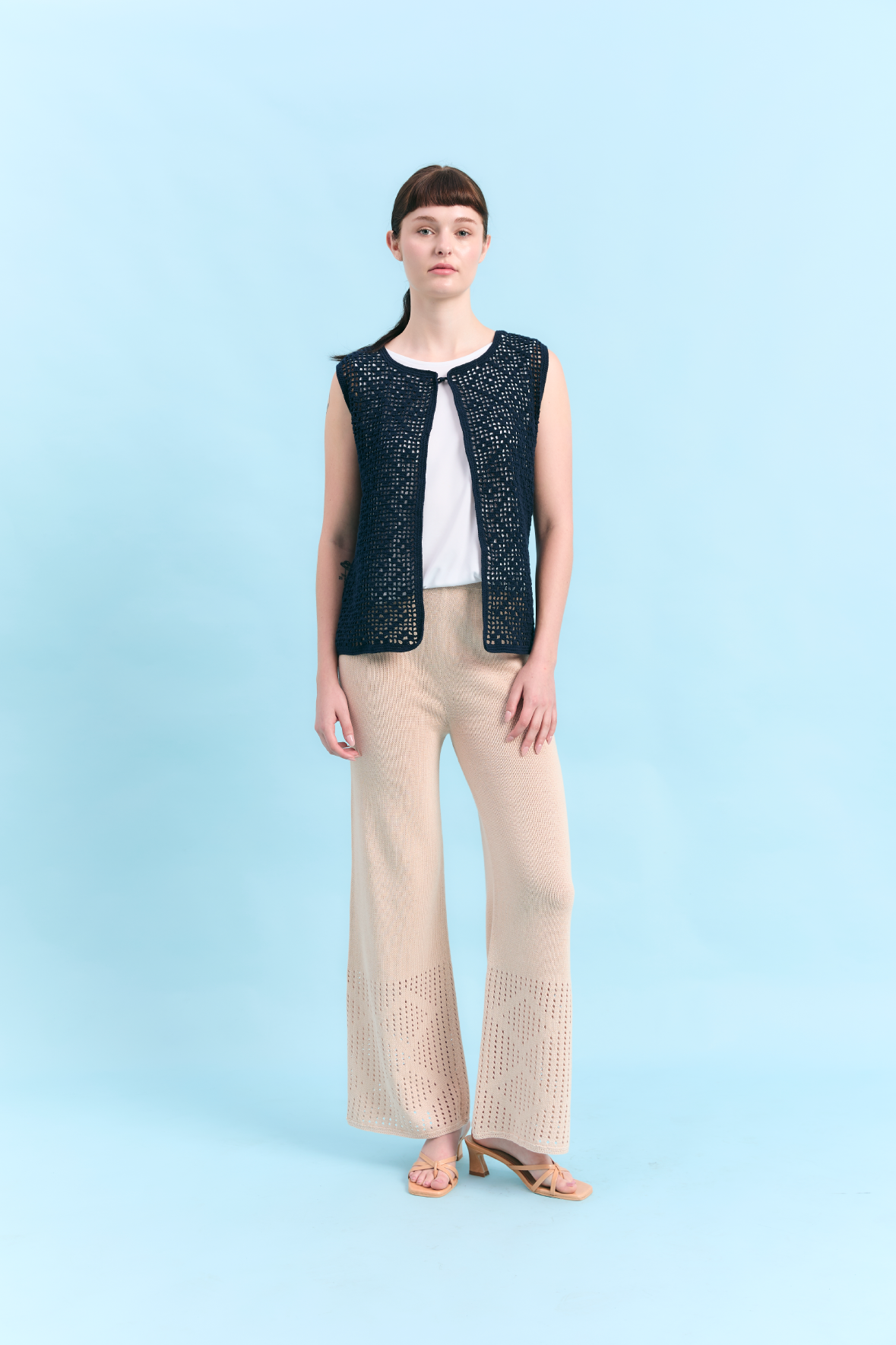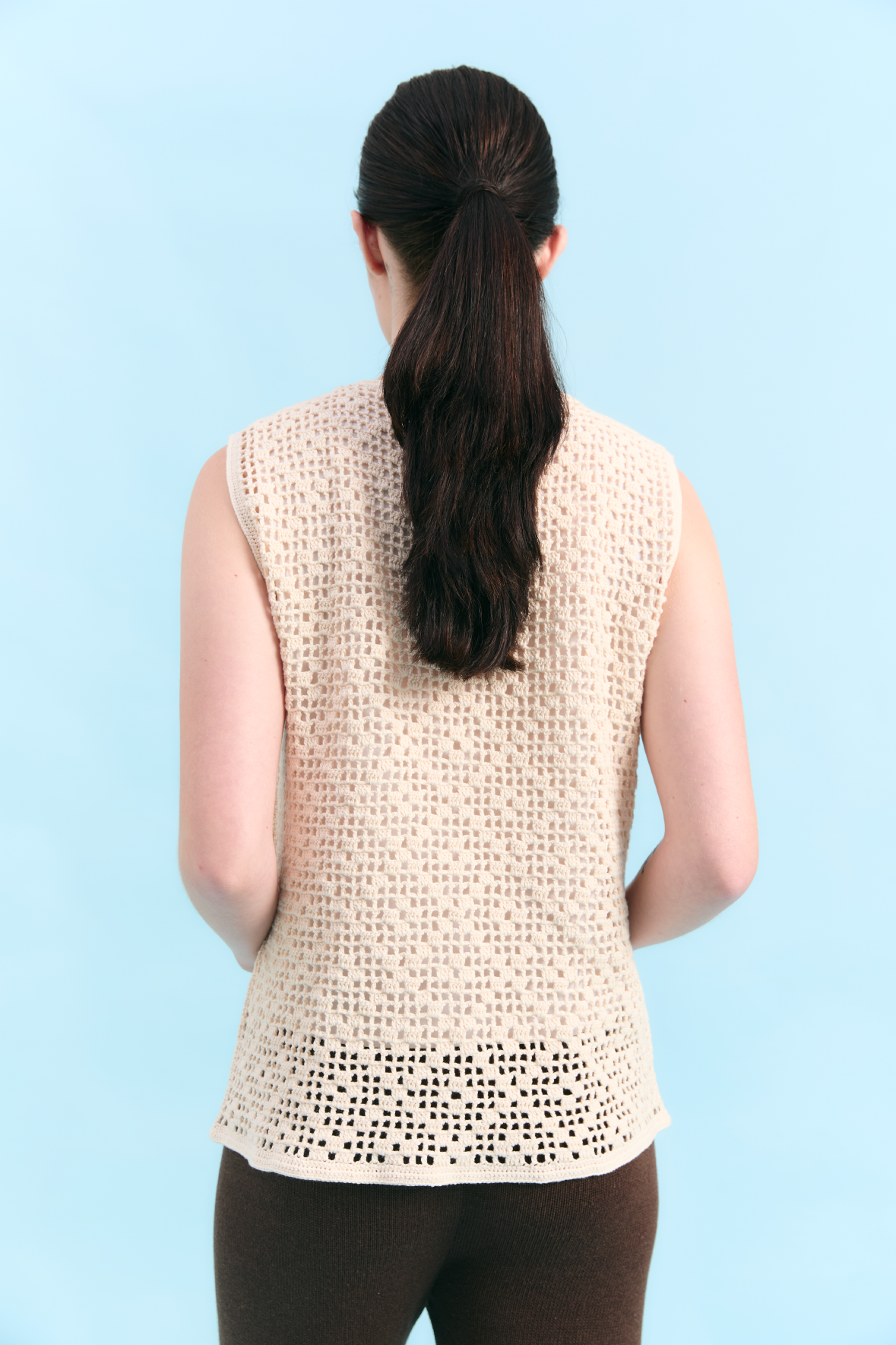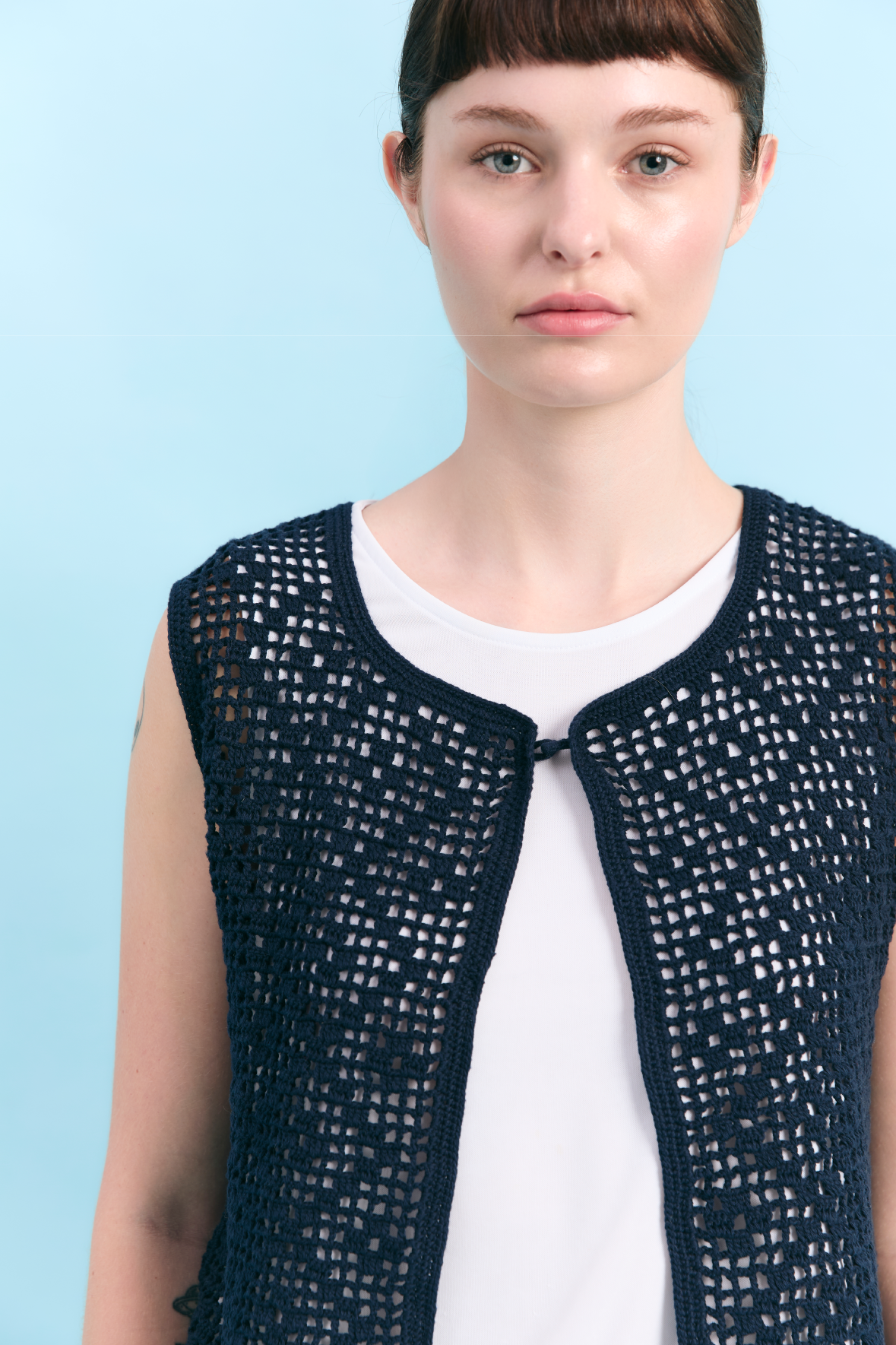 Chaleco de trama abierta que captura la ligereza del paisaje marino cubierto por bruma. Inspirado en las mallas costeras continuas, su diseño deja pasar el aire y la luz, aportando frescura y profundidad visual. Tejido en 100% algodón Pima, es una pieza versátil para superponer, que acompaña sin peso y suma textura con una presencia sutil y atemporal.