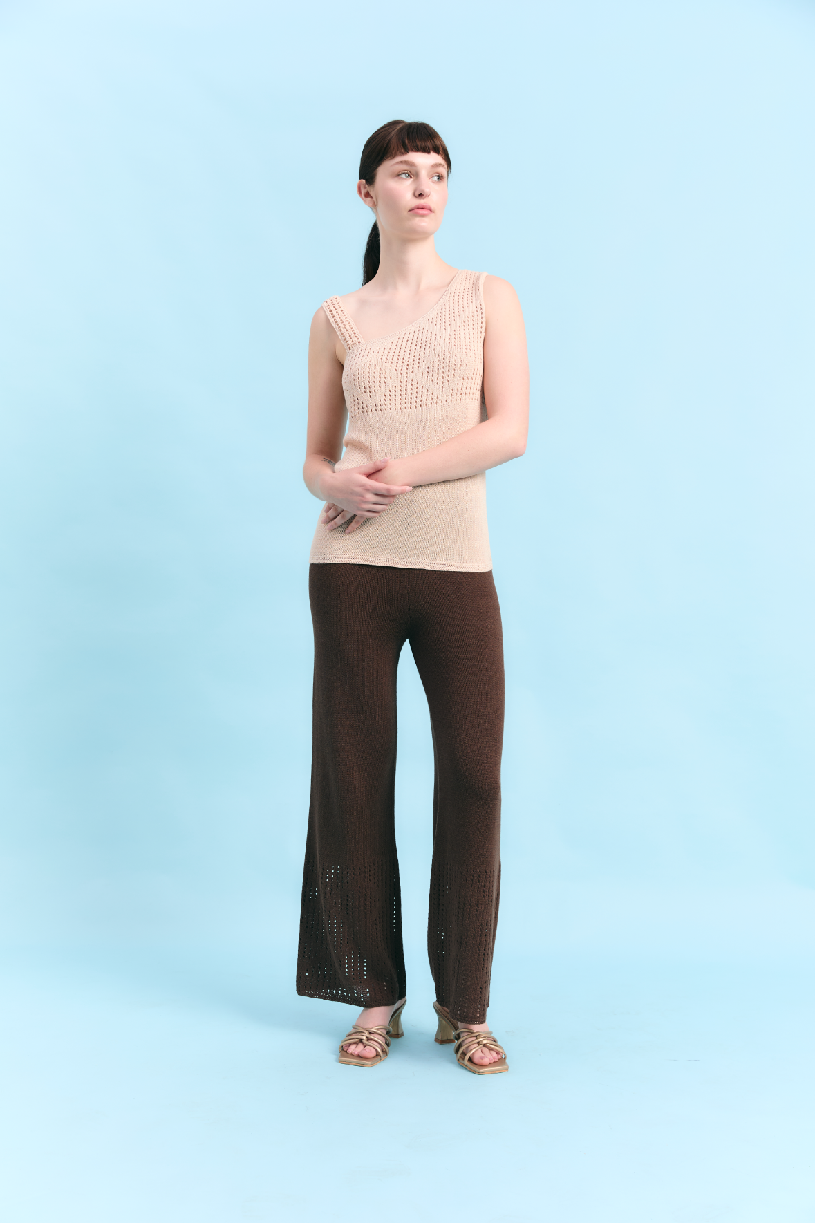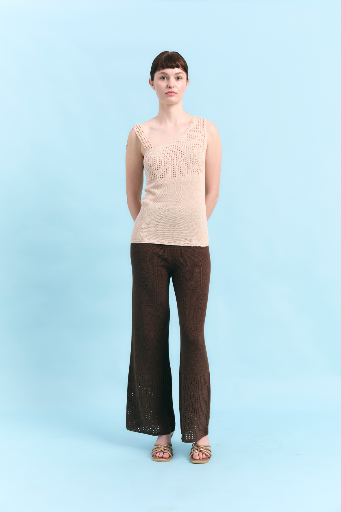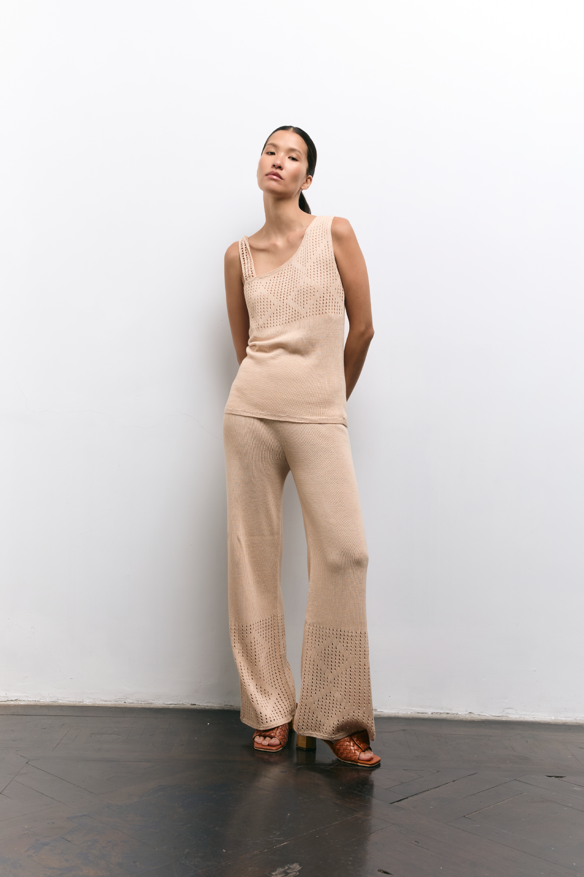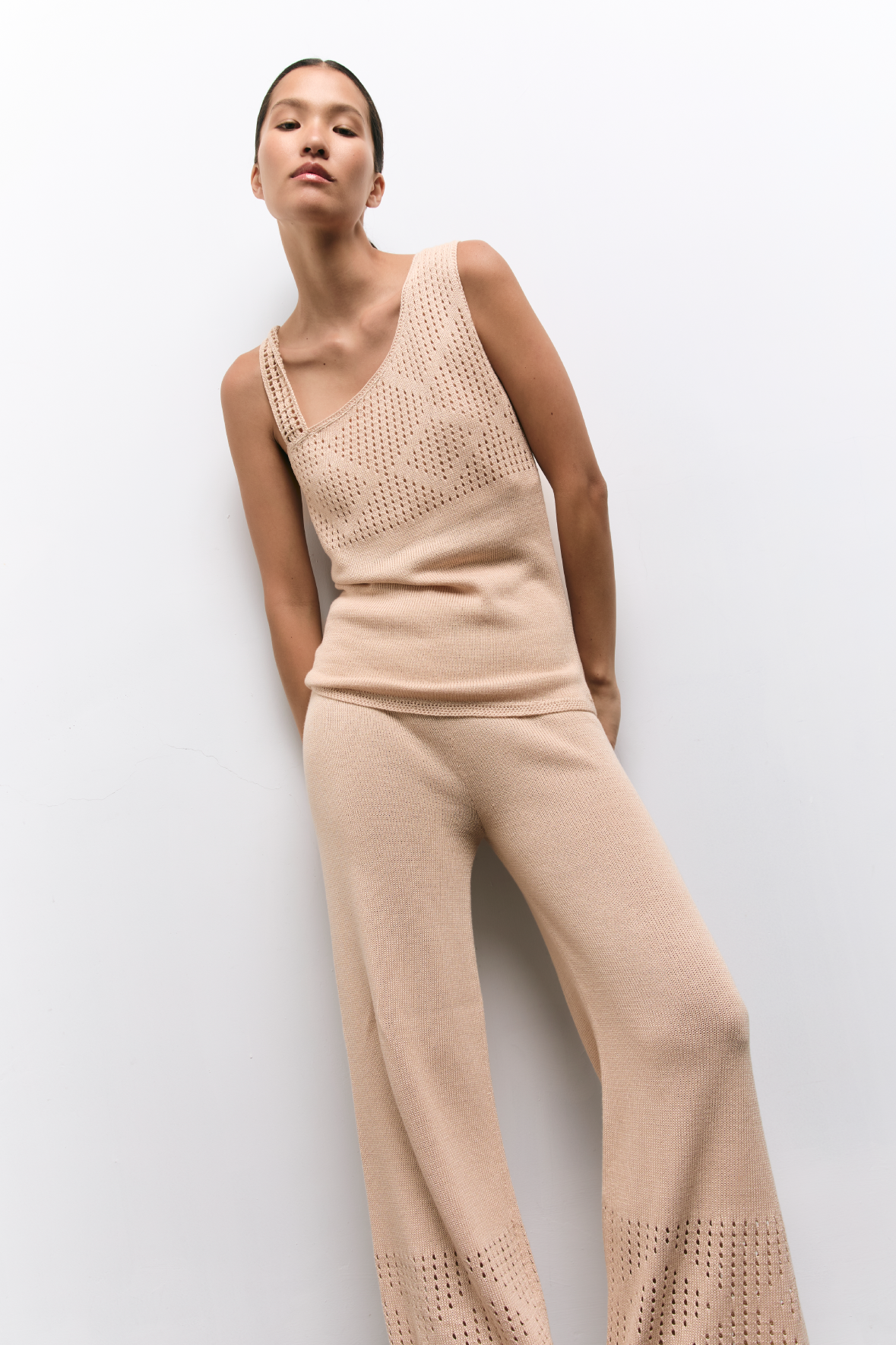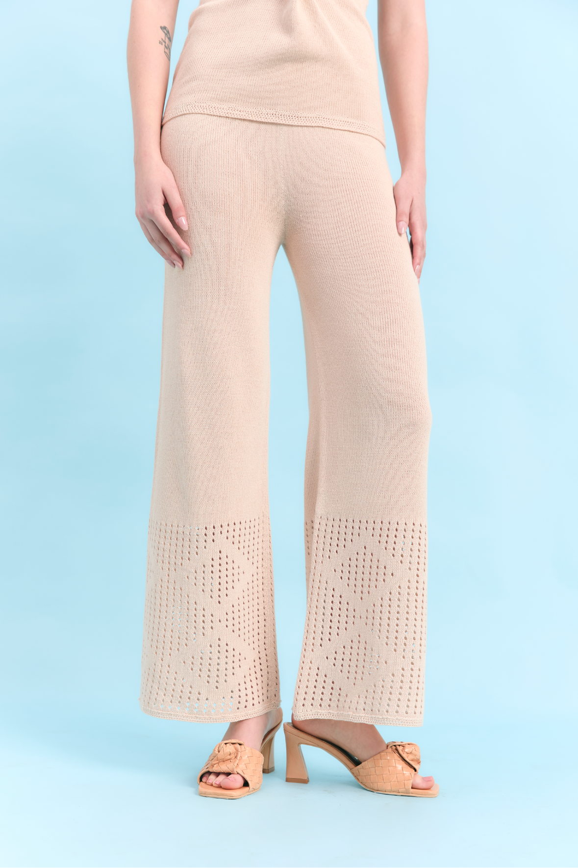 Pantalón recto de silueta relajada que transmite equilibrio y calma. Sus calados geométricos aportan textura y ligereza, mientras la caída fluida evoca el mar tranquilo del atardecer. Una pieza cómoda y elegante, diseñada para acompañar el cuerpo con libertad y una sensación constante de frescura.