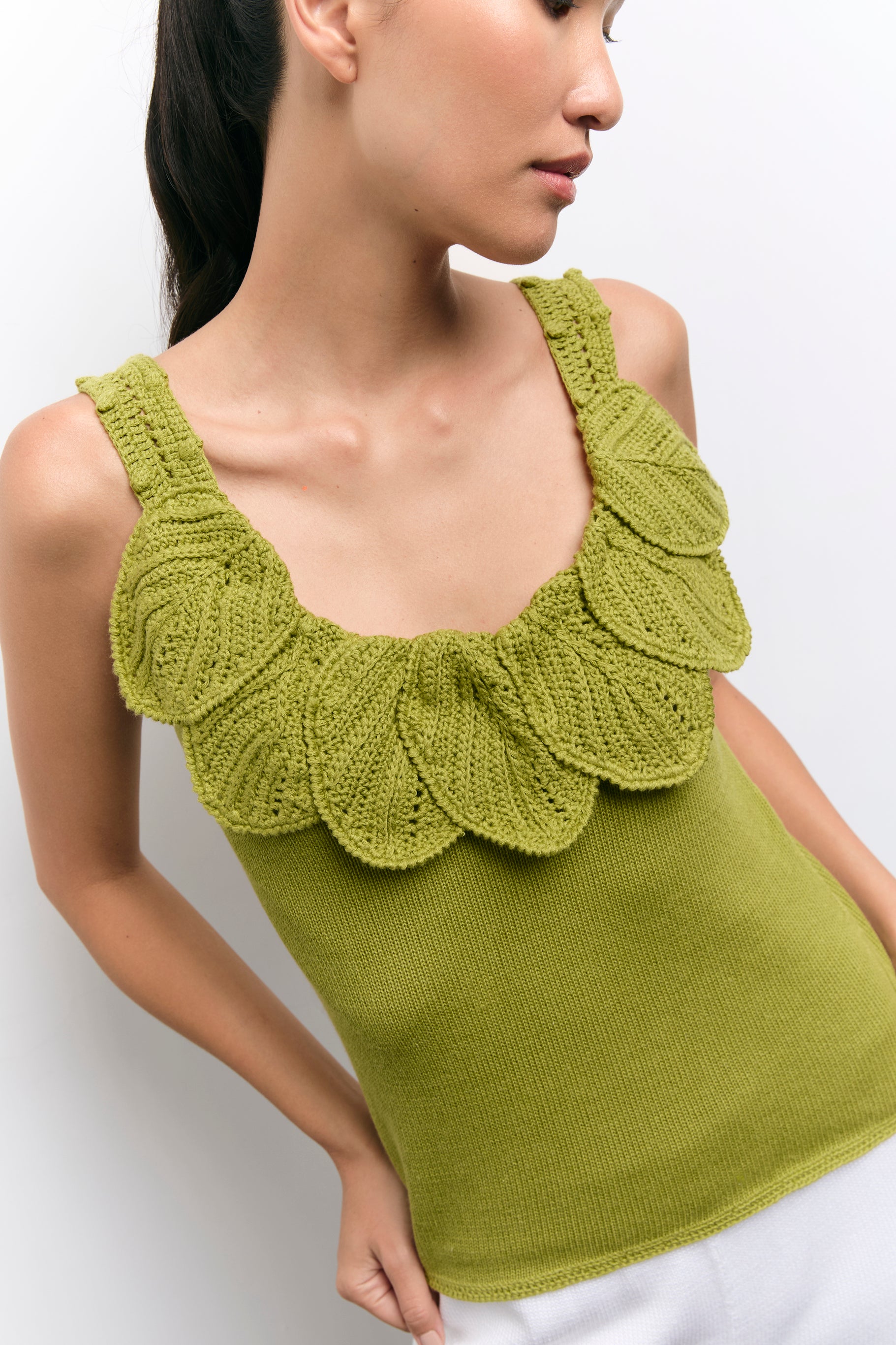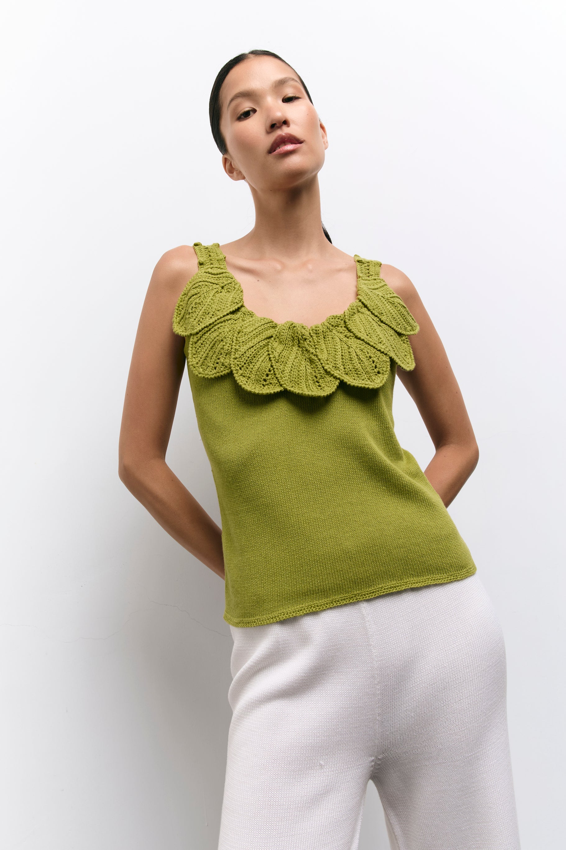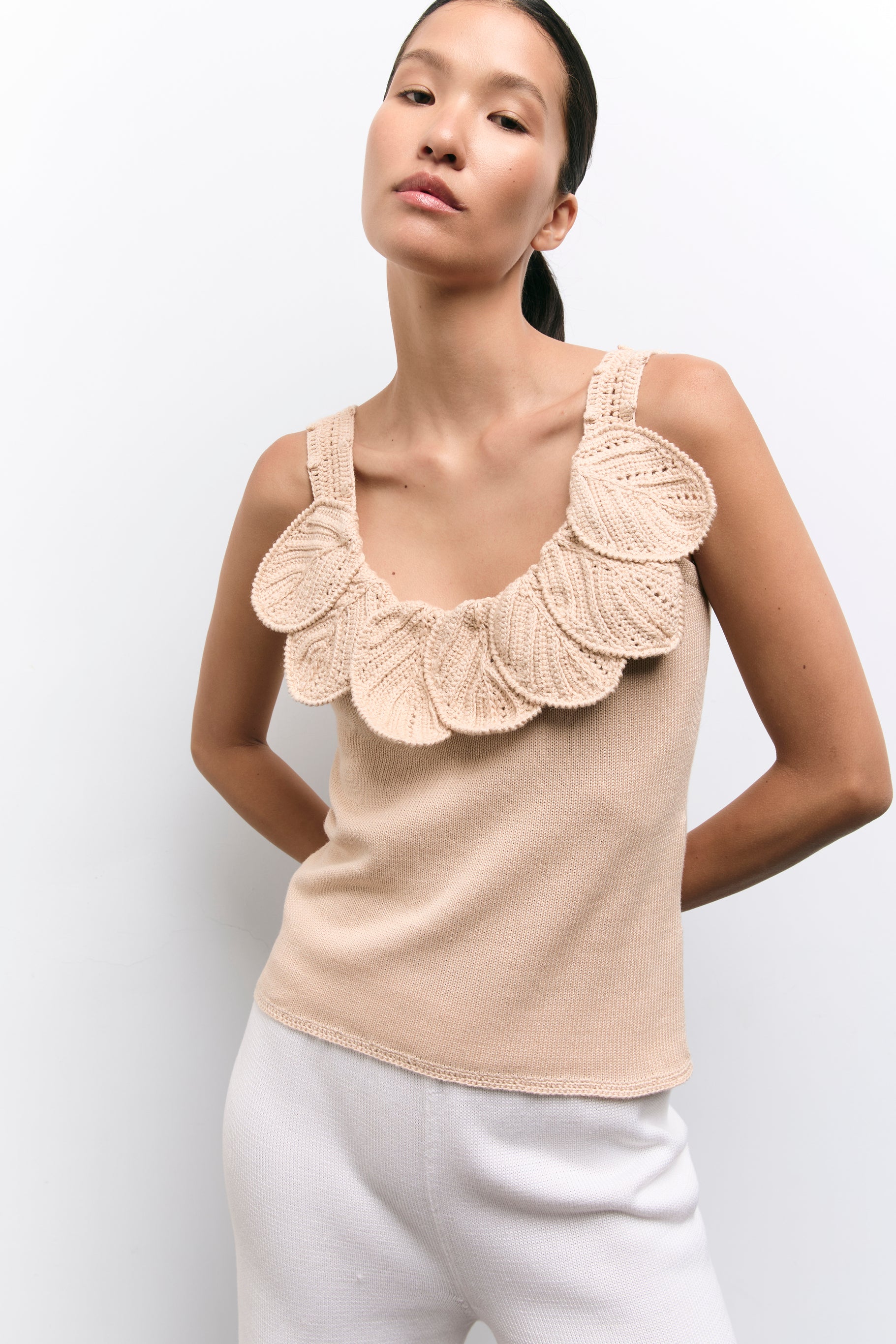 Top que evoca la delicadeza de las orquídeas peruanas en plena floración. Su escote, intervenido con pétalos desarrollados en crochet, dibuja formas orgánicas que aportan relieve y feminidad sutil. Tejido en una mezcla de algodón Tangüis, ofrece una textura suave y una caída ligera que acompaña el cuerpo con naturalidad. Una pieza fresca y expresiva, donde el detalle artesanal se convierte en protagonista con una elegancia atemporal.