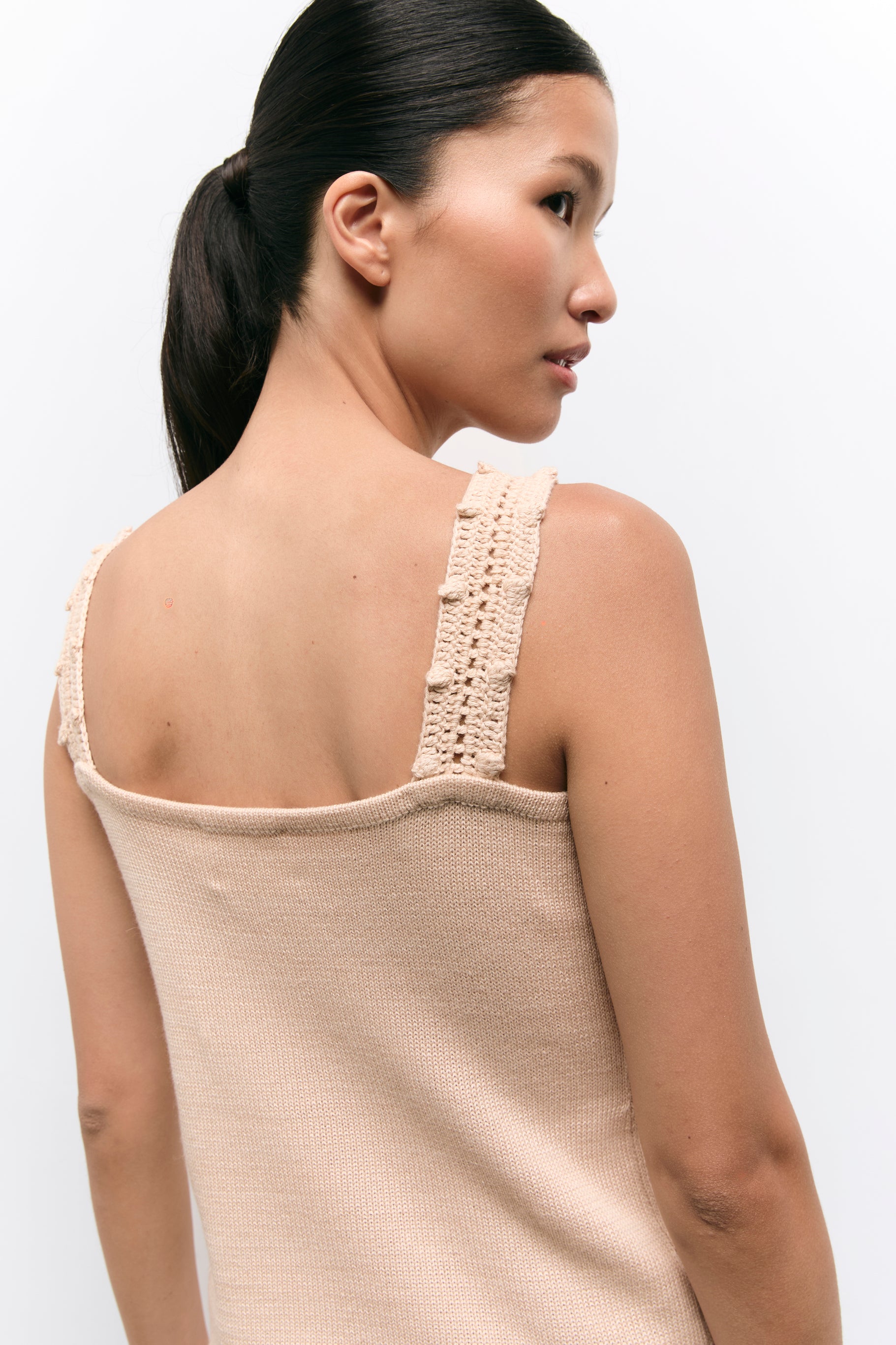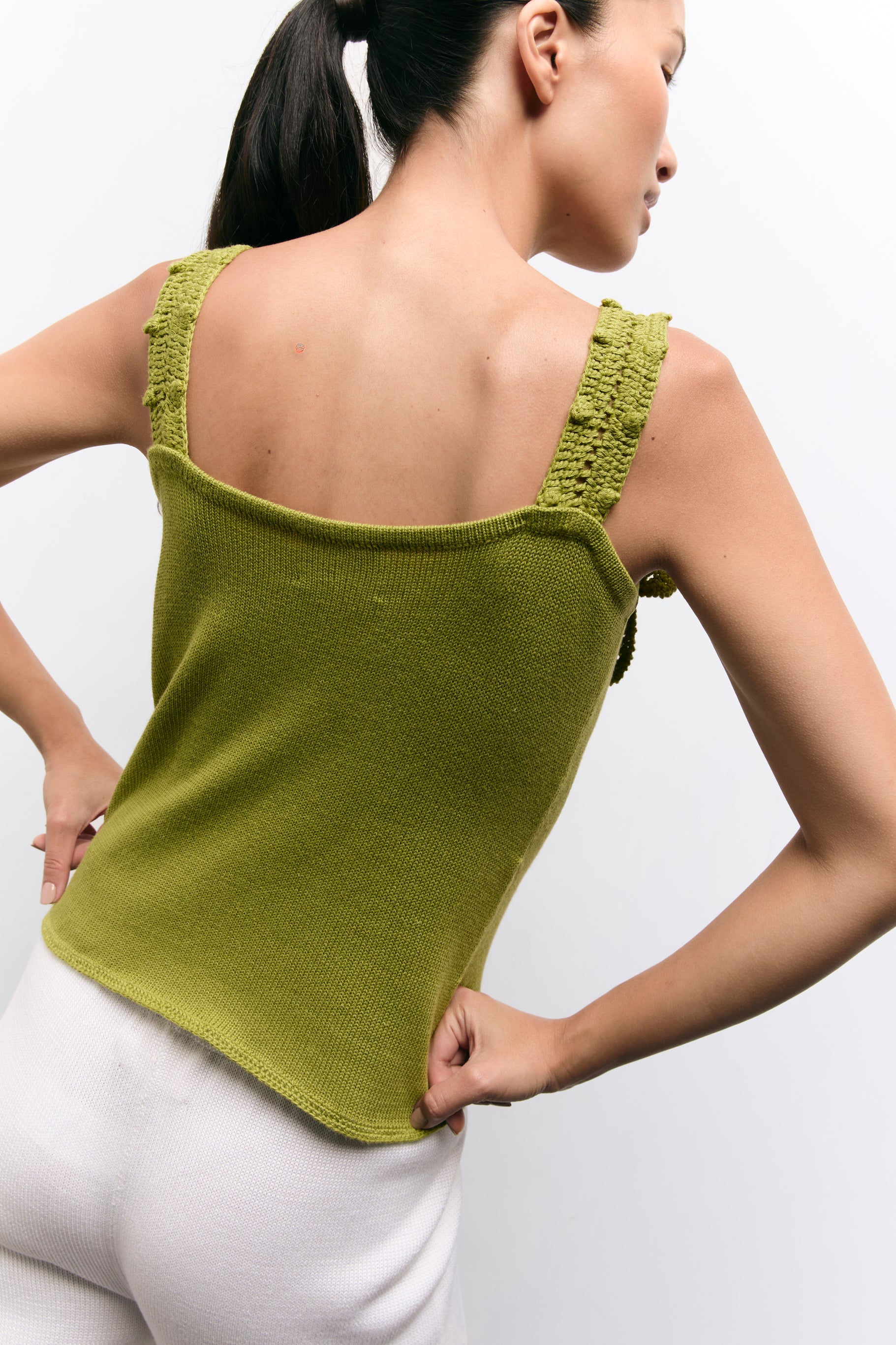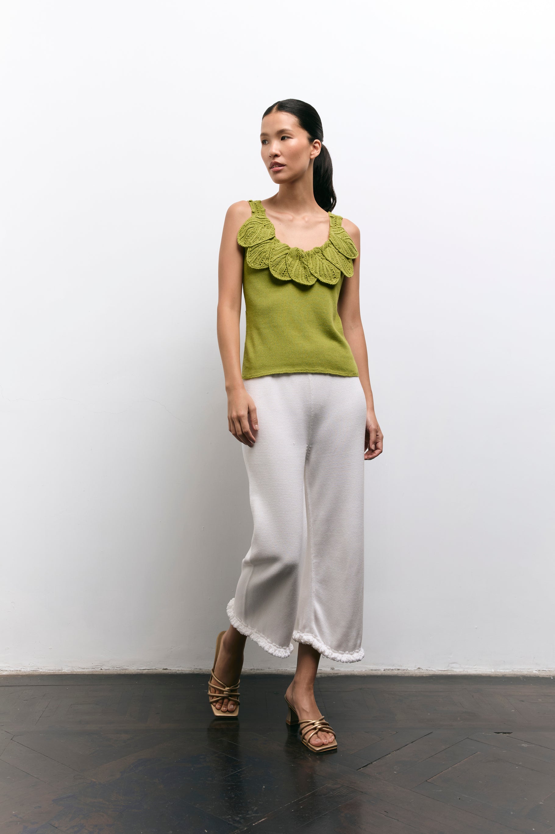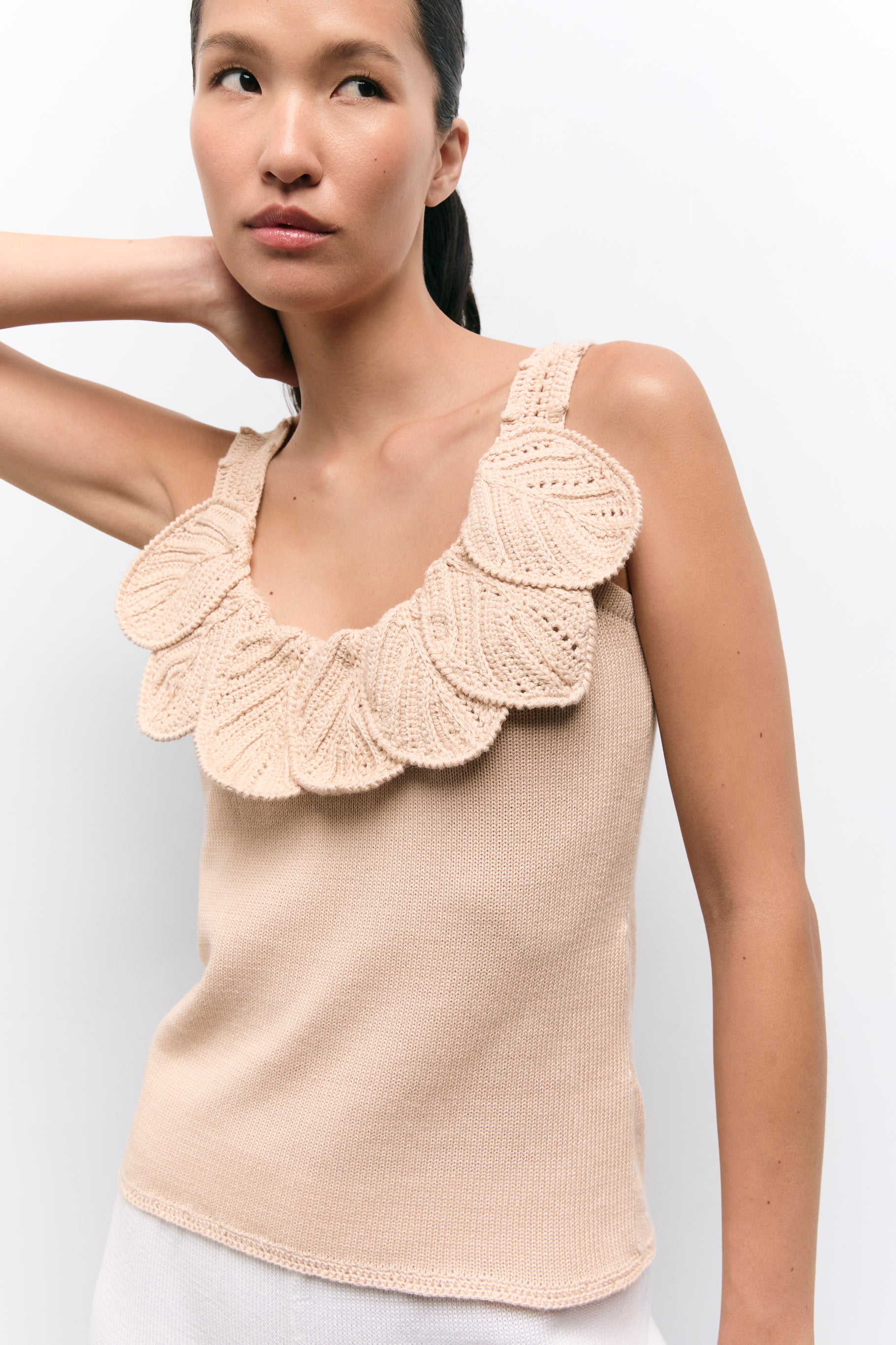 Top que evoca la delicadeza de las orquídeas peruanas en plena floración. Su escote, intervenido con pétalos desarrollados en crochet, dibuja formas orgánicas que aportan relieve y feminidad sutil. Tejido en una mezcla de algodón Tangüis, ofrece una textura suave y una caída ligera que acompaña el cuerpo con naturalidad. Una pieza fresca y expresiva, donde el detalle artesanal se convierte en protagonista con una elegancia atemporal.
