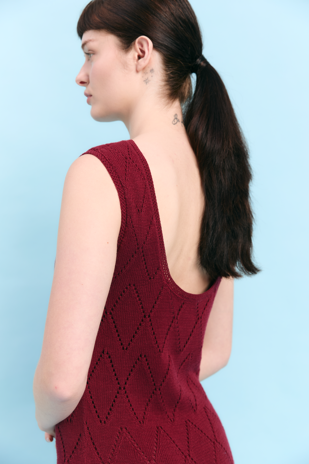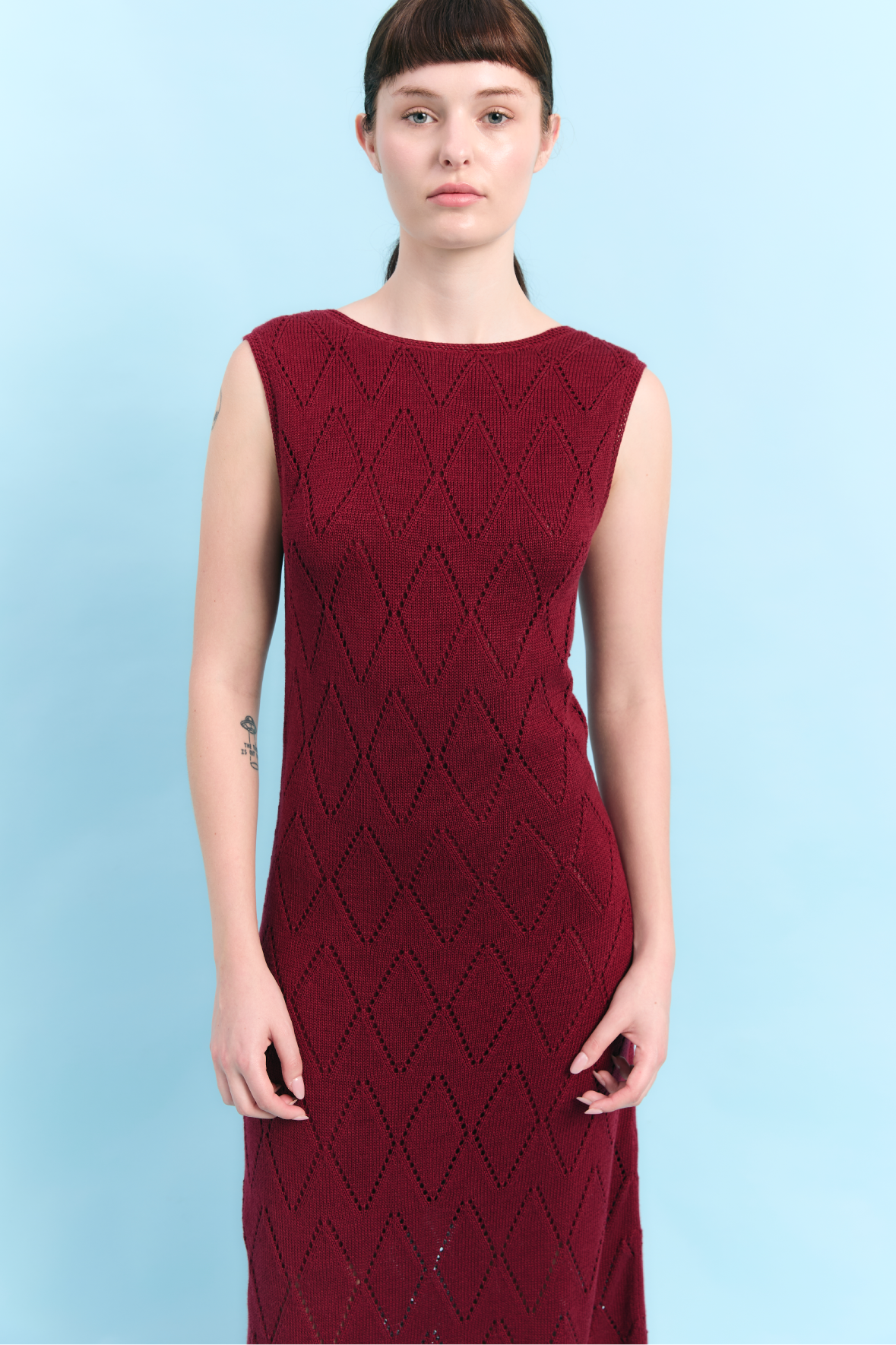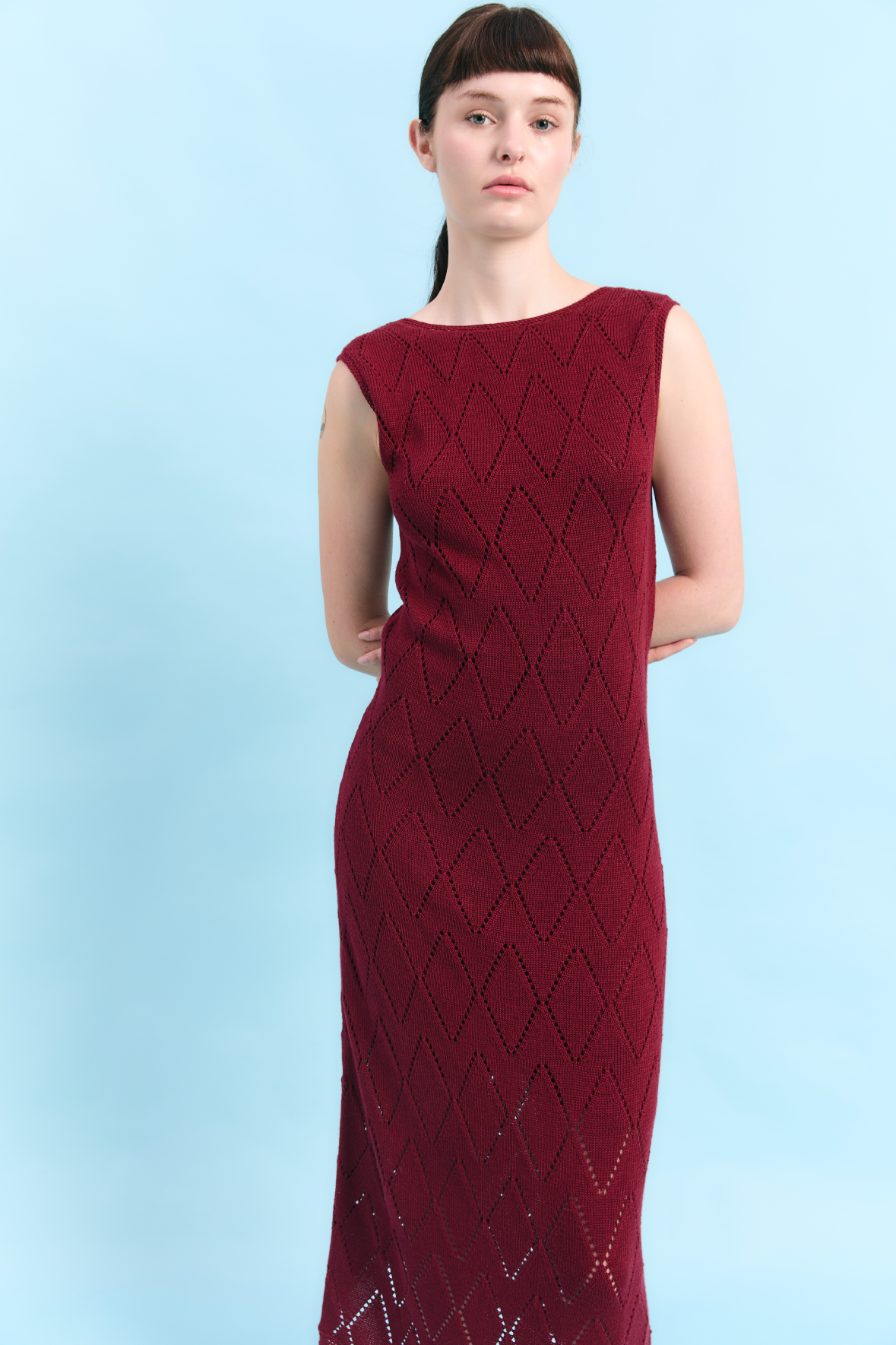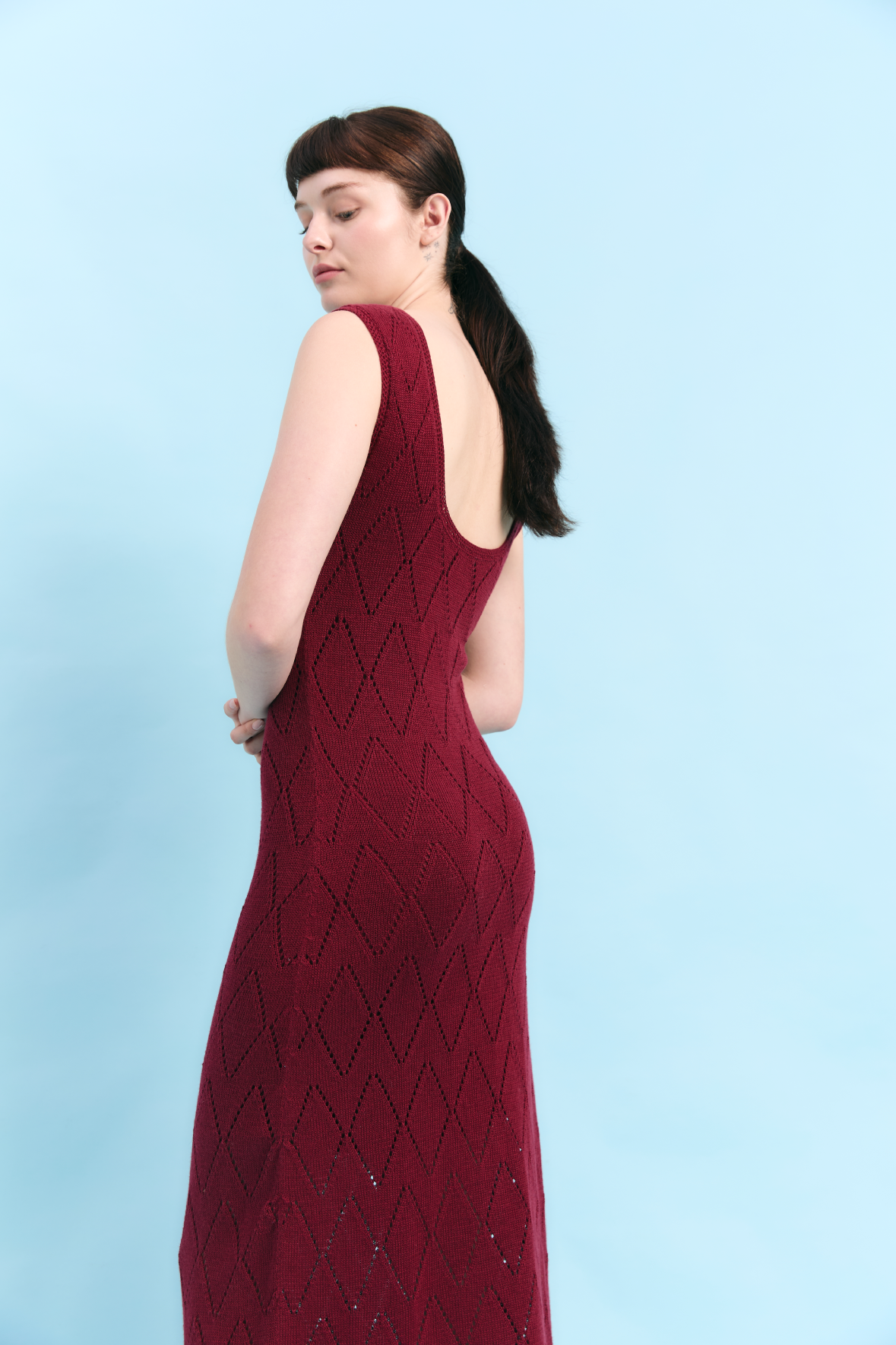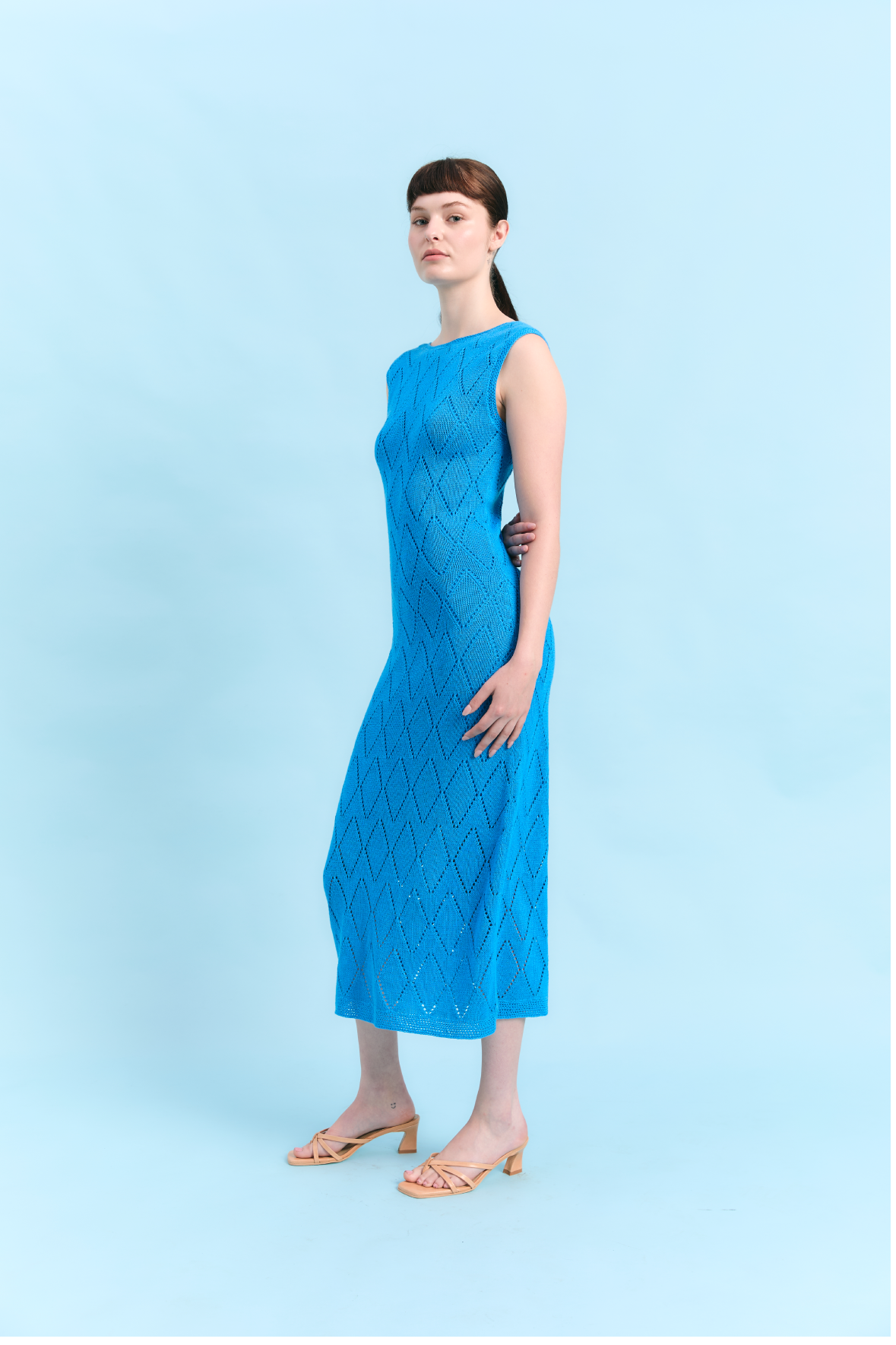 Vestido largo que equilibra estructura y fluidez a través de un patrón de rombos inspirado en la geometría natural de la roca costera. Su silueta limpia y su caída suave evocan la solidez del paisaje y la calma del mar. Tejido en 100% algodón Pima, destaca por su tacto delicado y acabado refinado, dando como resultado una pieza serena y atemporal.